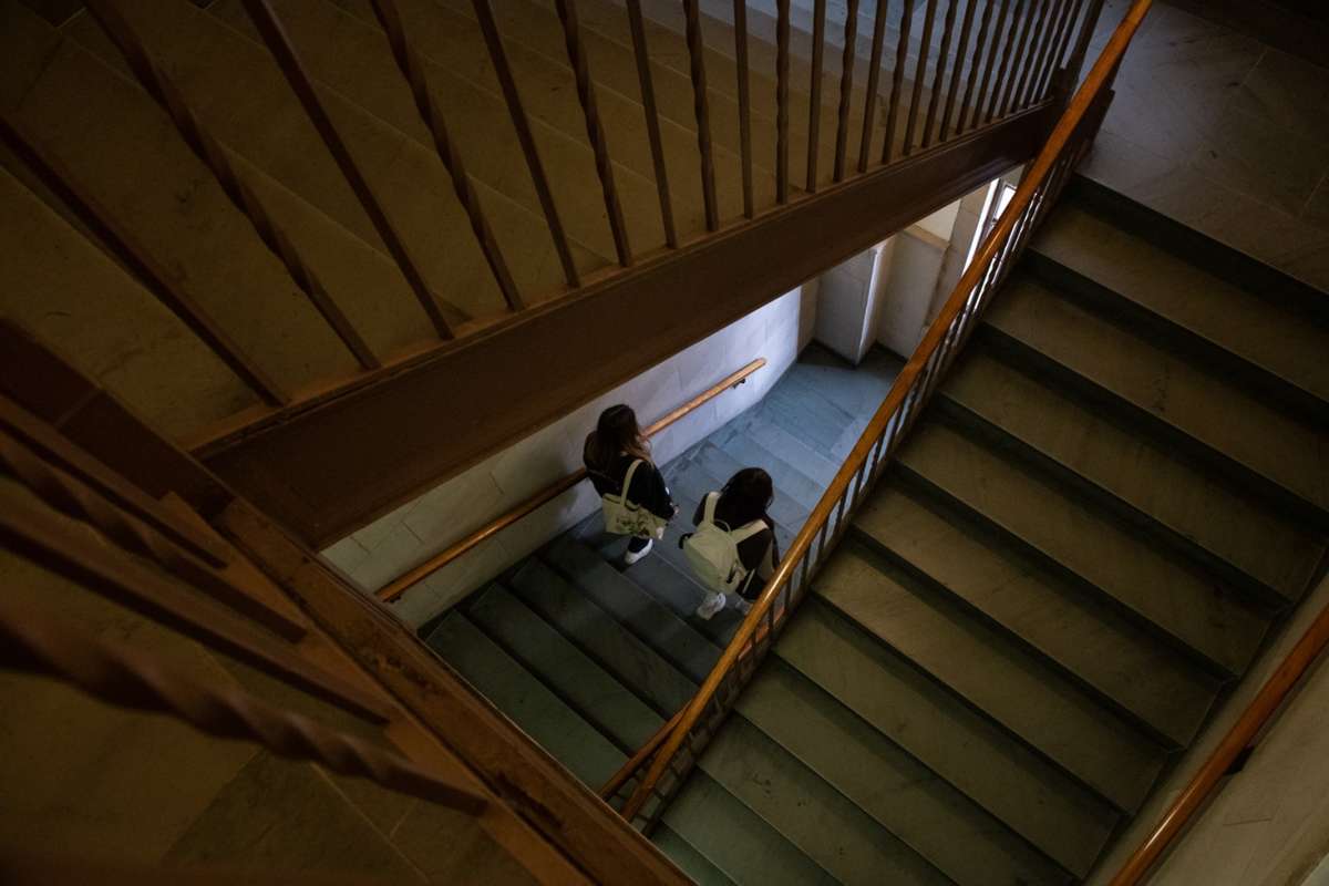 People walk down a stairwell in the University of Pittsburgh’s Cathedral of Learning, Tuesday, Oct. 18, 2022, in Oakland. The tower of classrooms and faculty offices was the site of a reported sexual assault that took place in one of the building’s stairwells while school was in session, late on a Monday afternoon in October, … Continued