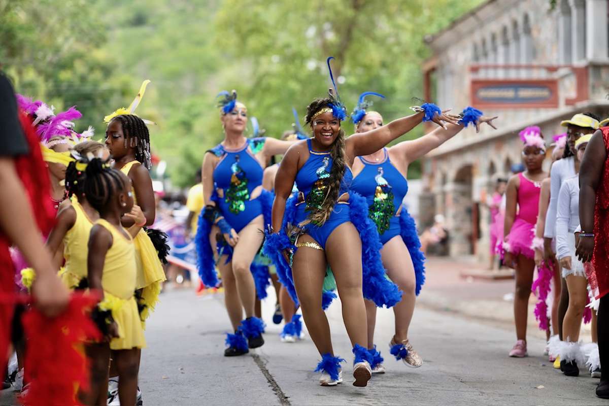 The glint of the first convertible carrying Parade Marshal George Lewis peeped around the Mongoose Junction bend around noon, signaling the start of hours filled with everything that the St. John Celebration is well known for: royalty, pans, majorettes, mokos on towering stilts, grassroots troupes and lots - and lots - of mas.