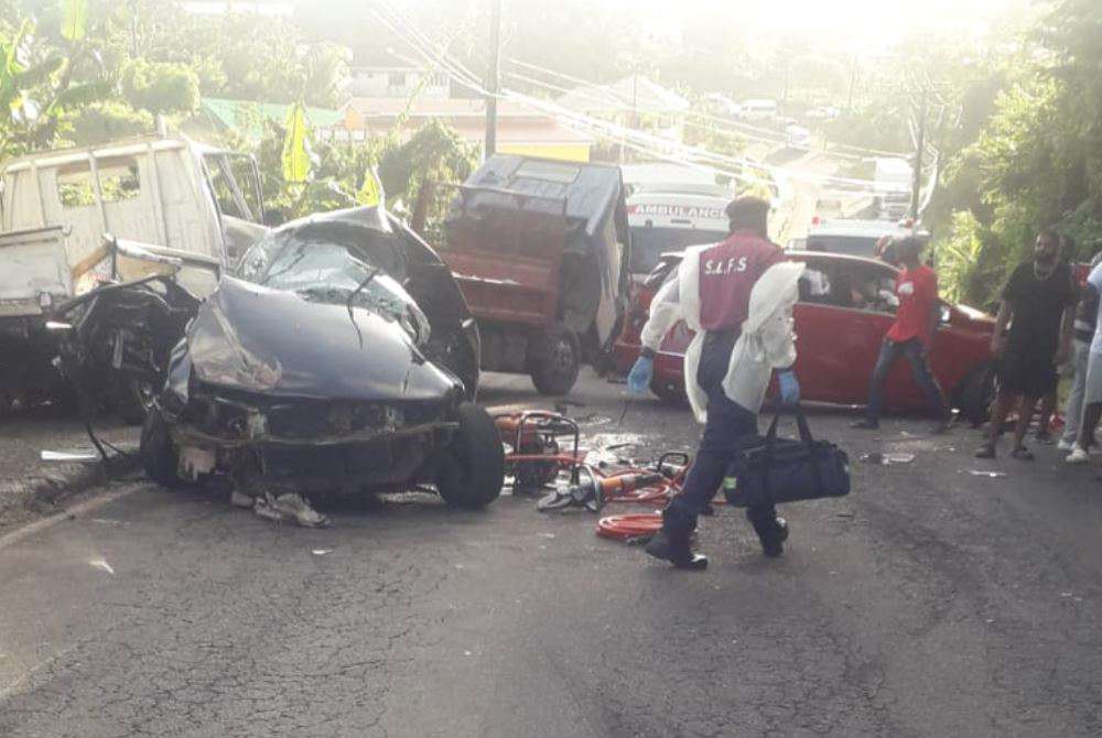 Saint Lucia Fire Service (SLFS) personnel transported four people to St. Jude Hospital after a multiple-vehicle collision at Mon Repos on Thursday.Emergency responders from the Micoud, Dennery, and Vieux Fort fire stations responded at about 3:58 pm after receiving a distress call.According to reports, the collision involved two cars and two trucks.Vieux Fort and Micoud fire station ambulances transported the injured individuals to the hospital.There are no further details at this time.https://youtube.com/shorts/g6dOAgNvAyQ?feature=shareHeadline photo from social media.