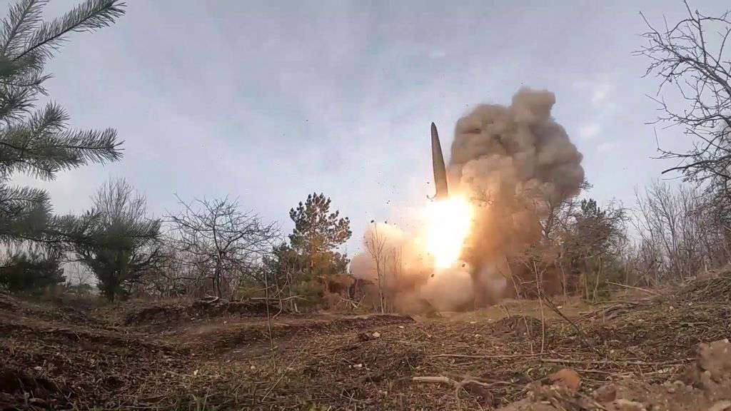 The Iskander mobile rocket system can be seen approaching the forest launch site covered in camouflaged netting.