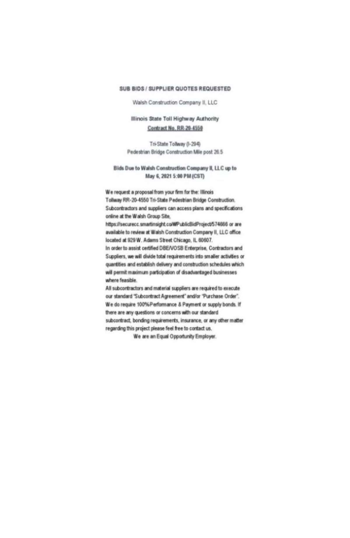The post SUB BIDS / SUPPLIER QUOTES REQUESTED: Walsh Construction Company II, LLC appeared first on Chicago Defender.